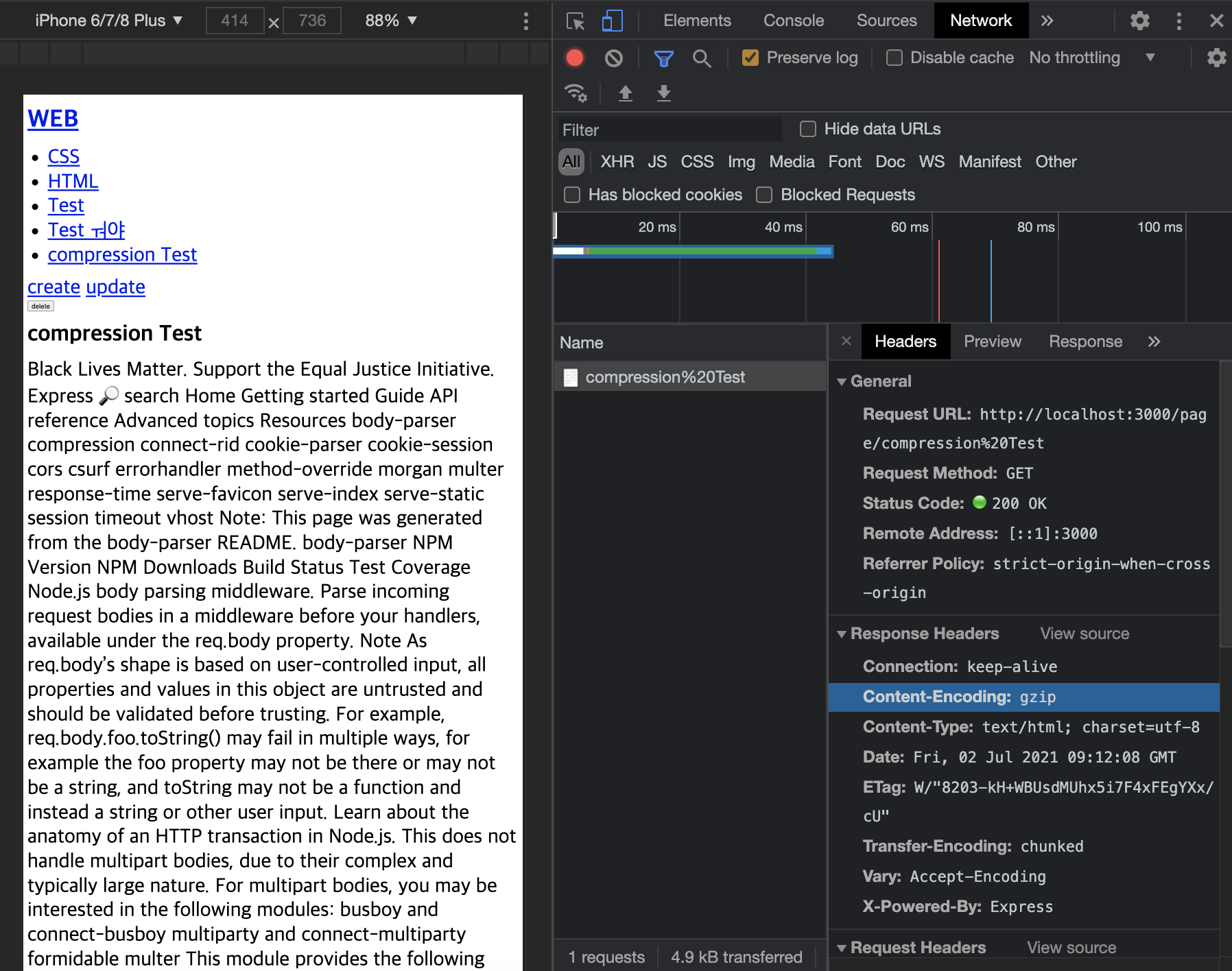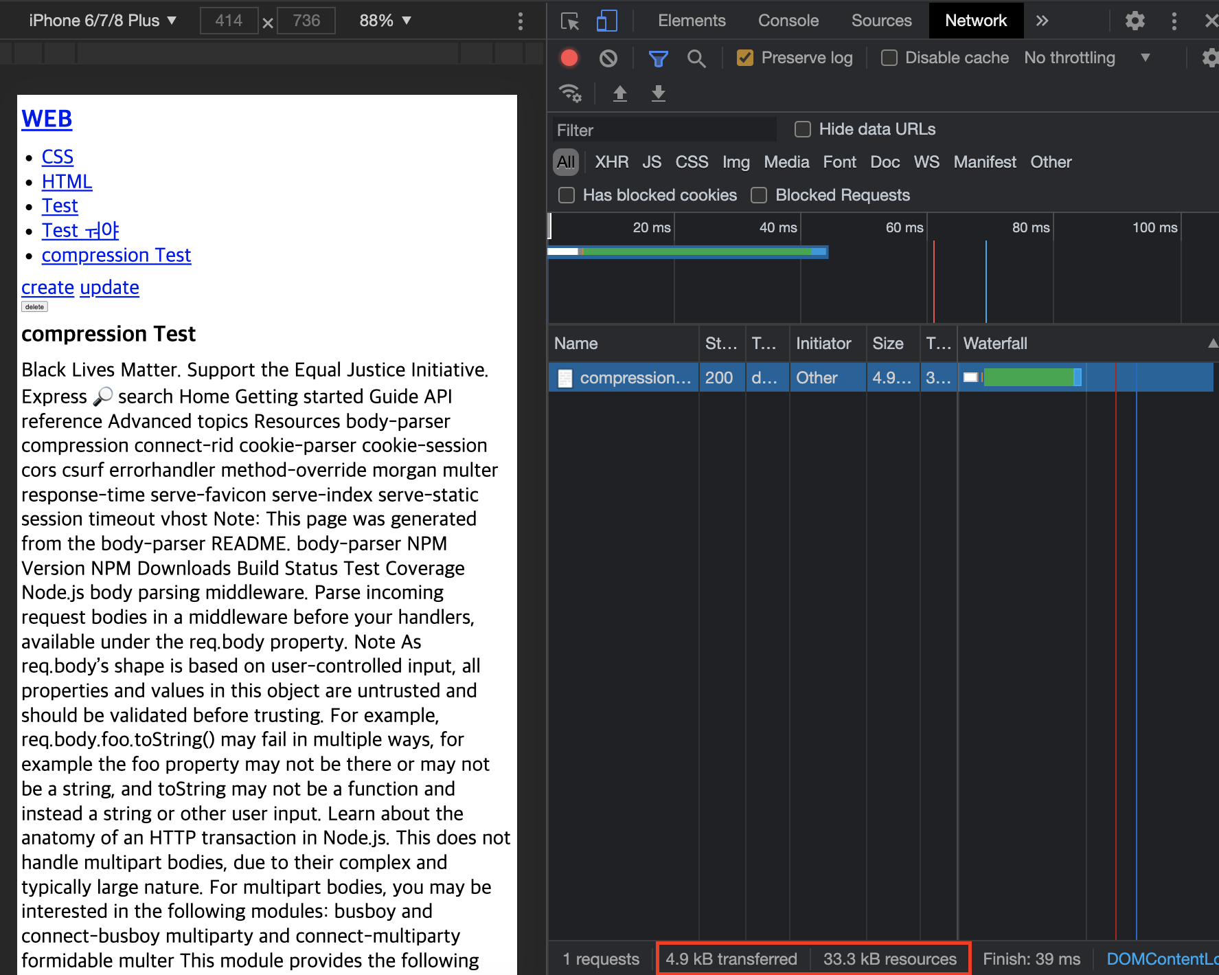 compression이 적용되고 원래 33.3 kB가 4.9kB 로 압축돼 네트워크에 전송되는것을 확인할 수 있다.