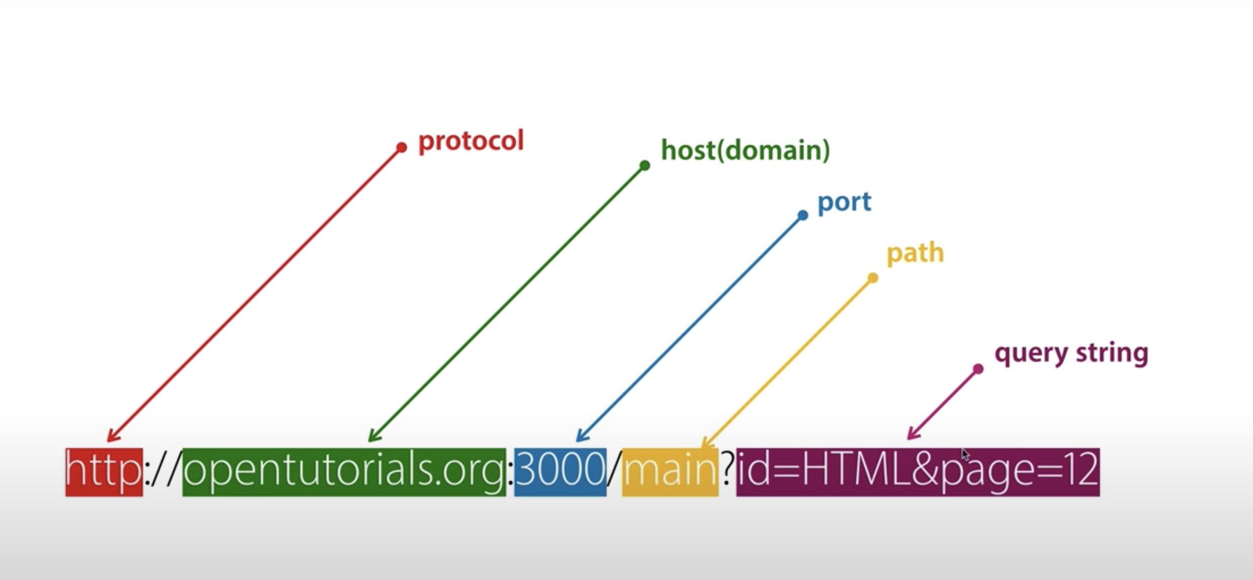 1)protocol통신규칙 2)host(domian)인터넷에접속돼있는각각의컴퓨터 3)port운영체제 통신의 종단점(= 연결되는 자리). 한대의 컴퓨터 안에 여러개의 서버가 있을 수 있다. 어떤 서버에 연결해줄지 알려주지 않으면 클라이언트가 접속했을때 어떤 서버와 통신할지가 애매해진다. 따라서 접속할때3000이라고명시해주면, 3000에연결돼있는서버와접속할 수 있게 된다. ex) app.listen(3000); 3000번포트에노드js웹서버를실행시킨것이기에접속했을때localhost:3000이라고명시한것. 4)path컴퓨터안에있는어떤디렉토리의어떤파일인지를가리킨다. 5)query string 사용자가 입력데이터를 전달하는 방법 중 하나. ex)?/id=HTML&page=12예제와 같이 쿼리스트링값을 변경하면웹서버에게어떤데이터( =내가읽고싶은정보는HTML이고12페이지)를전달할수있다.쿼리스트링의시작은물음표로하기로약속돼있고값과값은&를쓰기로약속돼있고값의이름과값은=로구분하도록약속돼있다.