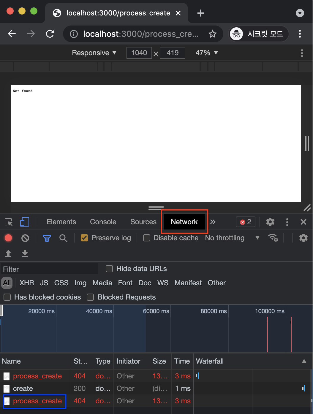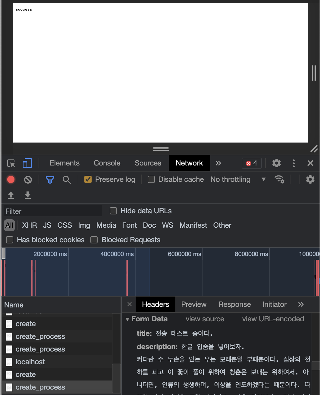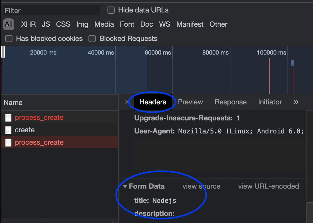 form action 이 잘 작동하지 않았음을 확인할 수 있다.else if(pathname==='/create'){ fs.readdir('./data',function(error,filelist){ var title = 'Web - create'; var list = templateList(filelist); var template = templateHTML(title,list,` <form action="http://localhost:3000/process_create" method="post"> <p><input type="text" name="title" placeholder="text"></p> <p> <textarea name="description" placeholder="description"></textarea> </p> <p><input type="submit"></p> </form> `); response.writeHead(200); response.end(template); });